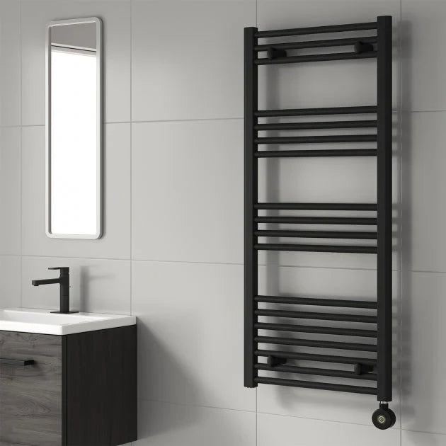 Reina Ashen Steel Black Heated Vertical Designer Towel Radiator