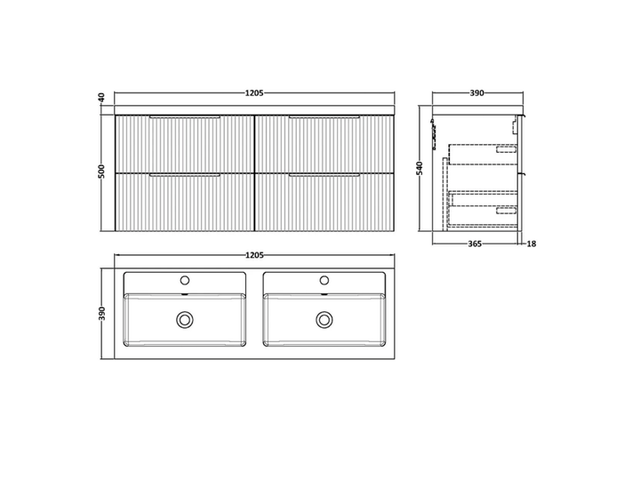 Fully fluted design, ideal for creating a truly stunning art deco inspired bathroom. Stunning satin finish. Finger pull handle design. Soft-close doors and drawers ensures peace ensues throughout your home. Supplied rigid for easy installation. Double polymarble basin pre-drilled with two tap holes. (1200mm)
